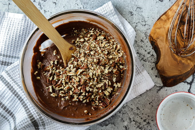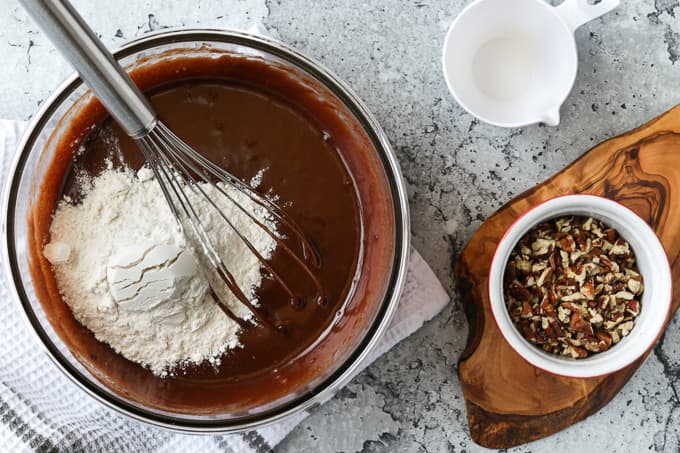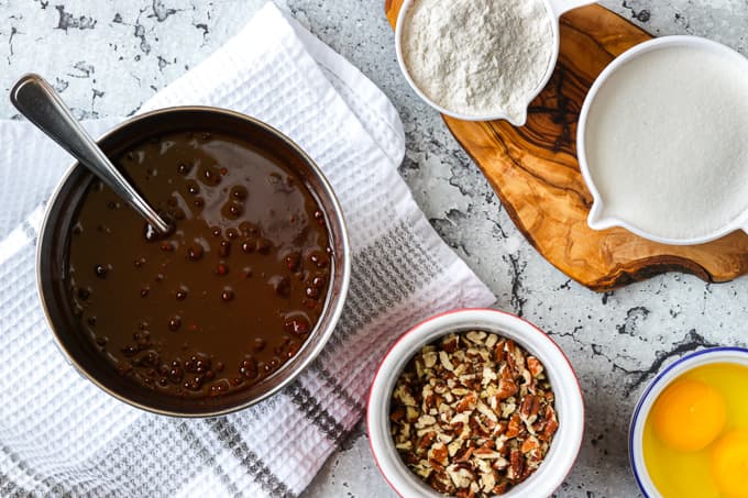 Set the chocolate mixture aside to cool while you chop the pecans or walnuts. Whichever you use is fine but you can also omit the nuts if you prefer.