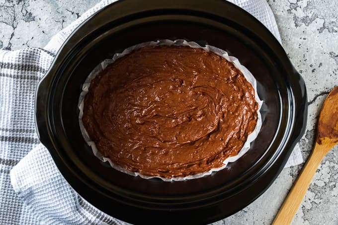 Transfer the chocolate brownie batter to the prepared slow cooker and cook on low heat for 2 hours and 15 minutes approximately.
