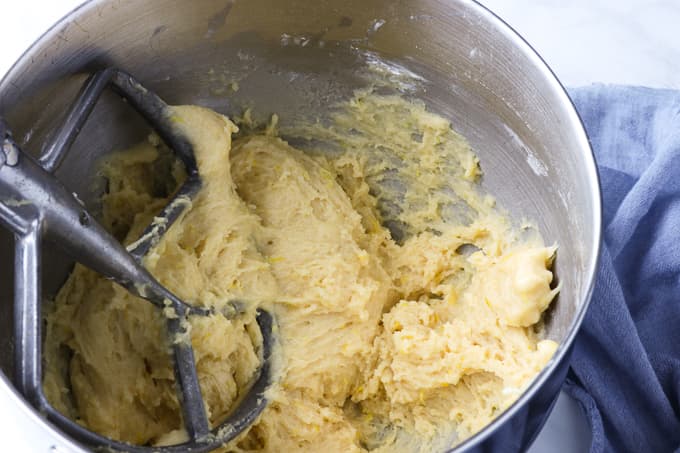 - Mix in the flour mixture beating for 1 minute til the dough is thoroughly combined.