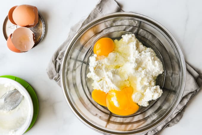 - In a stand mixer or a hand held mixer, beat together the eggs and the ricotta cheese just until fairly smooth.