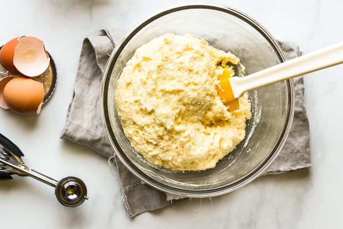 I prefer to use a cookie scoop of approximately 1 1/2 inch in diameter but you can just as easily use two spoons to drop the dough into the hot oil. Just be careful to avoid any splashes.